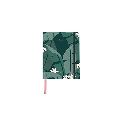 UO 8435449351758 Agenda 2021 2022 Semana Vista TAMAÑO PEQUEÑO 13x16cm. Tropical. Papel 100gr, goma elástica, cinta registro raso, horarios semanales, 12 meses ilustrados, Verde
