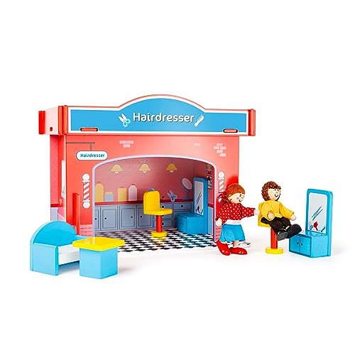 Small Foot 10856 Playhouse - Salón de Madera para Cabello, Incluye Muebles, muñecas Flexibles y Muebles de Colores Impresos