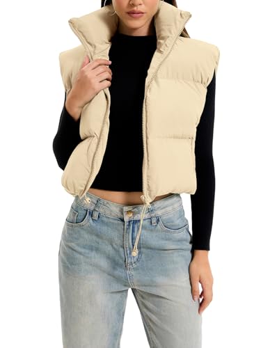 OYIGELZ Chaleco acolchado de moda para mujer, cuello alto, cremallera, corto, chaleco acolchado para mujer, chaquetas abrigos, Khaki-W, L Report This